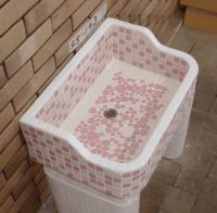 モルタル下地にモザイクタイルを張ったタイル流し台。