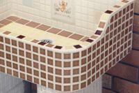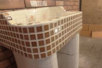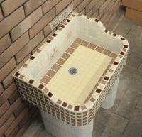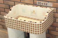 モルタル下地にモザイクタイルを張ったタイル流し台。