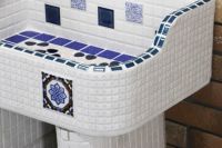 モルタル下地にモザイクタイルを張ったタイル流し台。