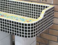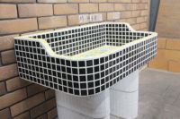 モルタル下地にモザイクタイルを張ったタイル流し台。