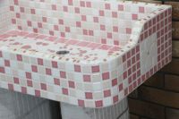 モルタル下地にモザイクタイルを張ったタイル流し台。