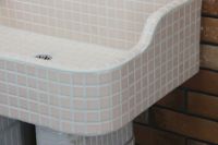 モルタル下地にモザイクタイルを張ったタイル流し台。