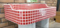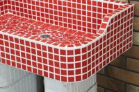 モルタル下地にモザイクタイルを張ったタイル流し台。