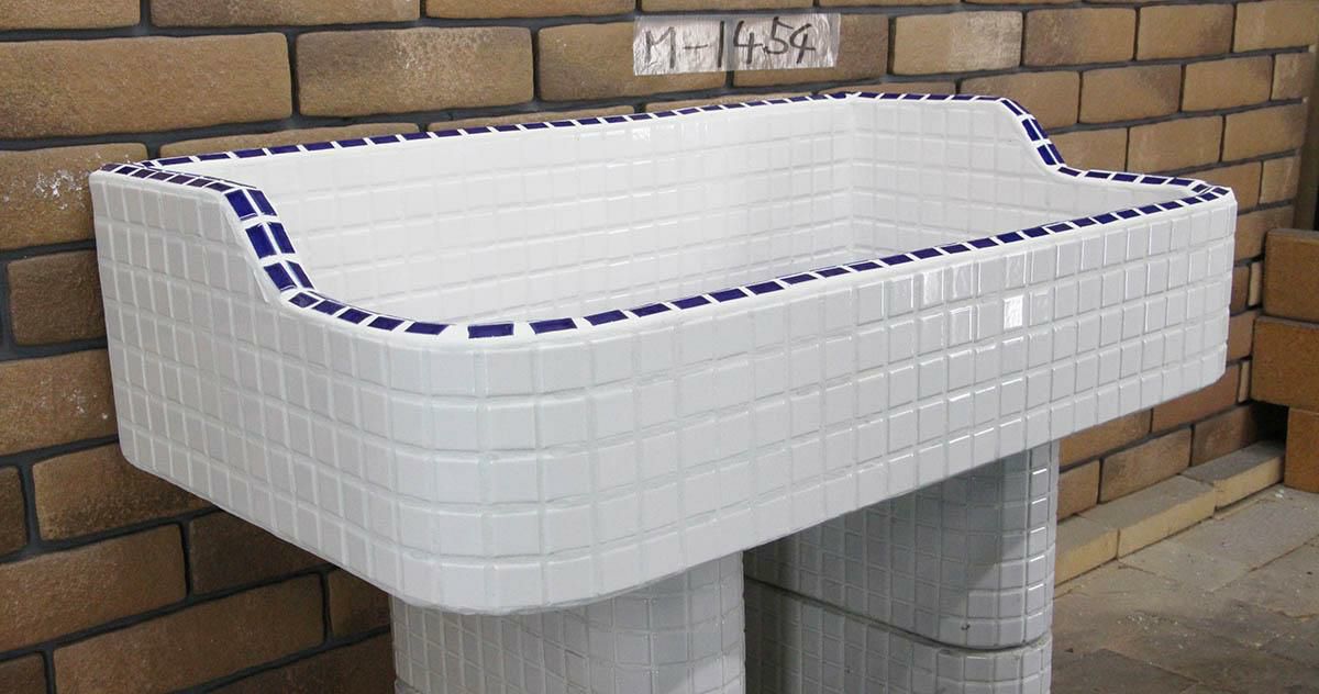 玉川窯業では、モルタル下地のシンクにモザイクタイルを張ってガーデンパンを制作しており、すべて職人が丹精を込めて製作している1点ものです。