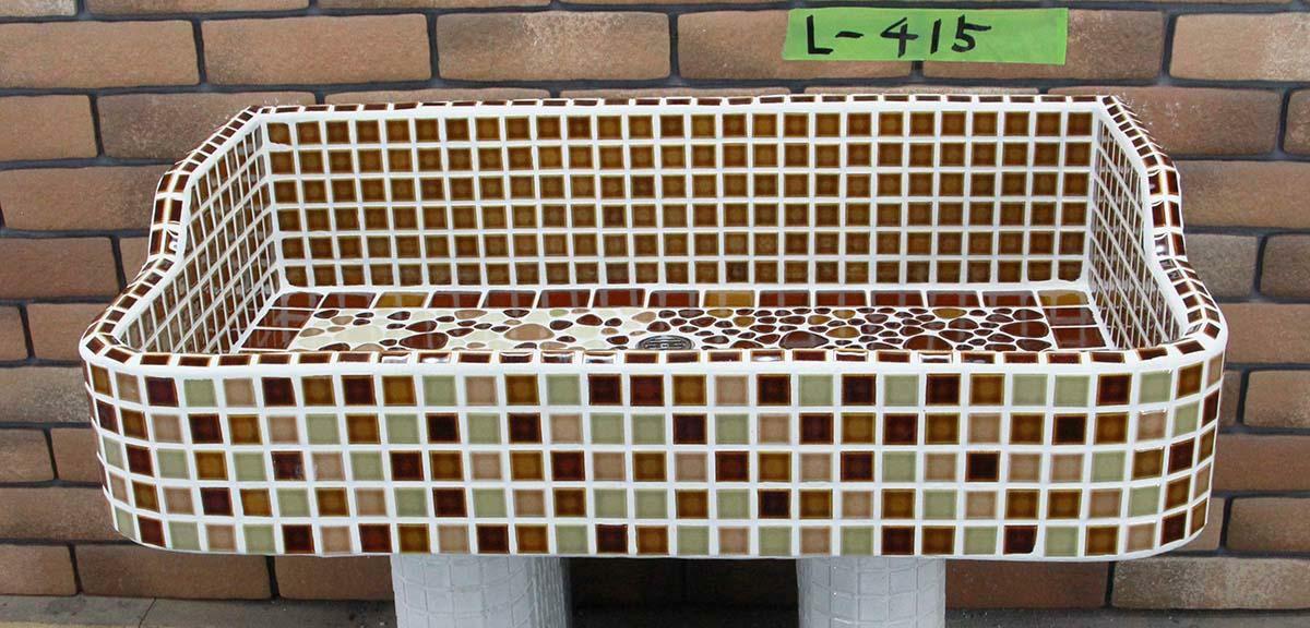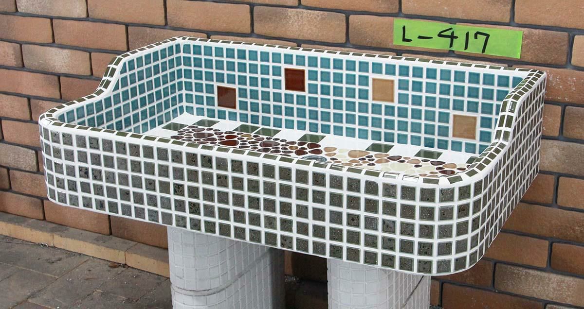 玉川窯業では、モルタル下地のシンクにモザイクタイルを張ってガーデンパンを制作しており、