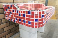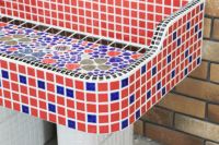 モルタル下地にモザイクタイルを張ったタイル流し台。