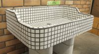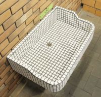 モルタル下地にモザイクタイルを張ったタイル流し台。