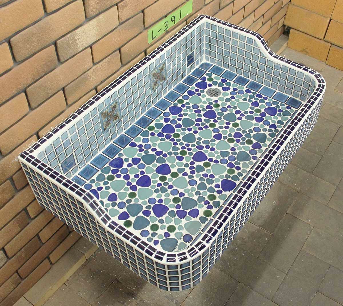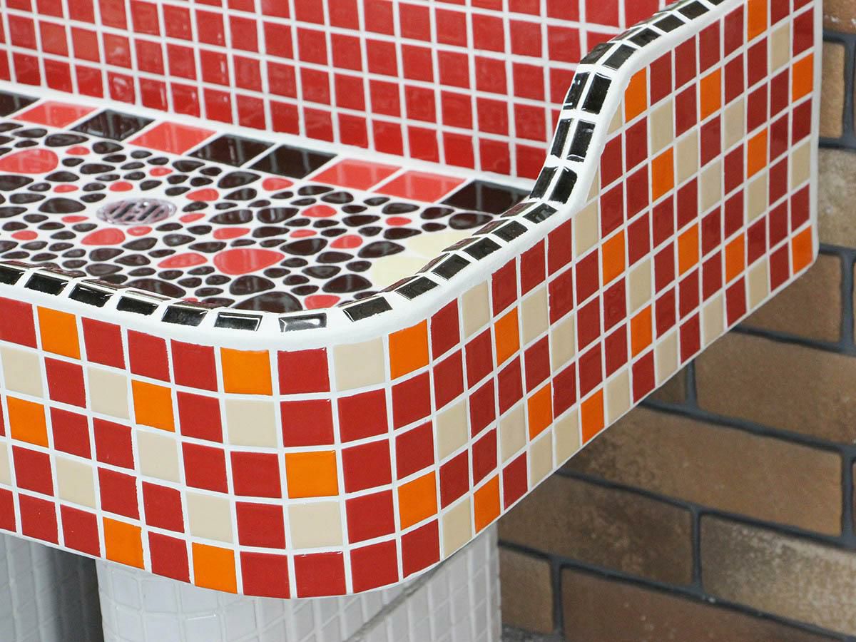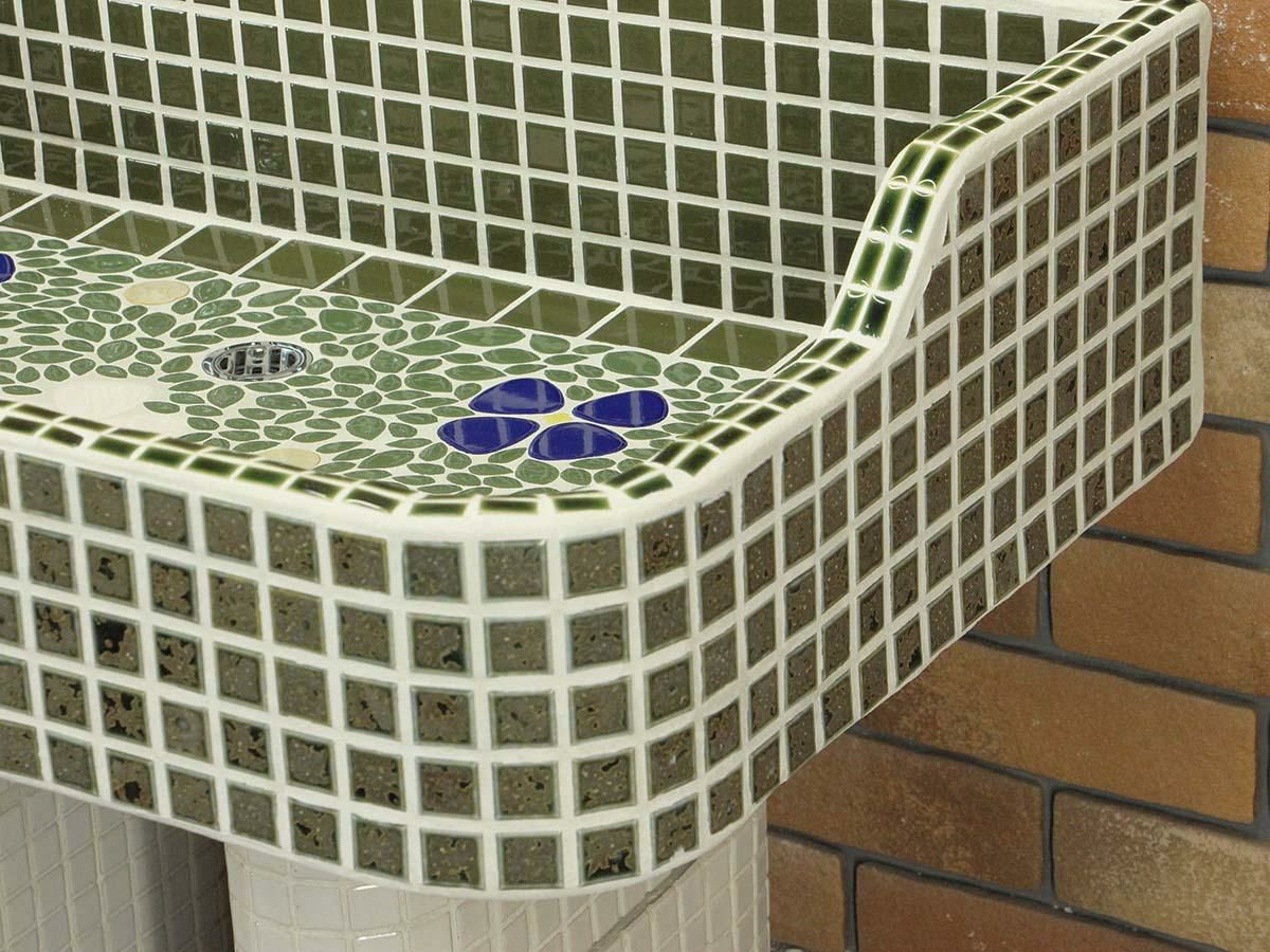 玉川窯業では、モルタル下地のシンクにモザイクタイルを張ってガーデンパンを制作しており、