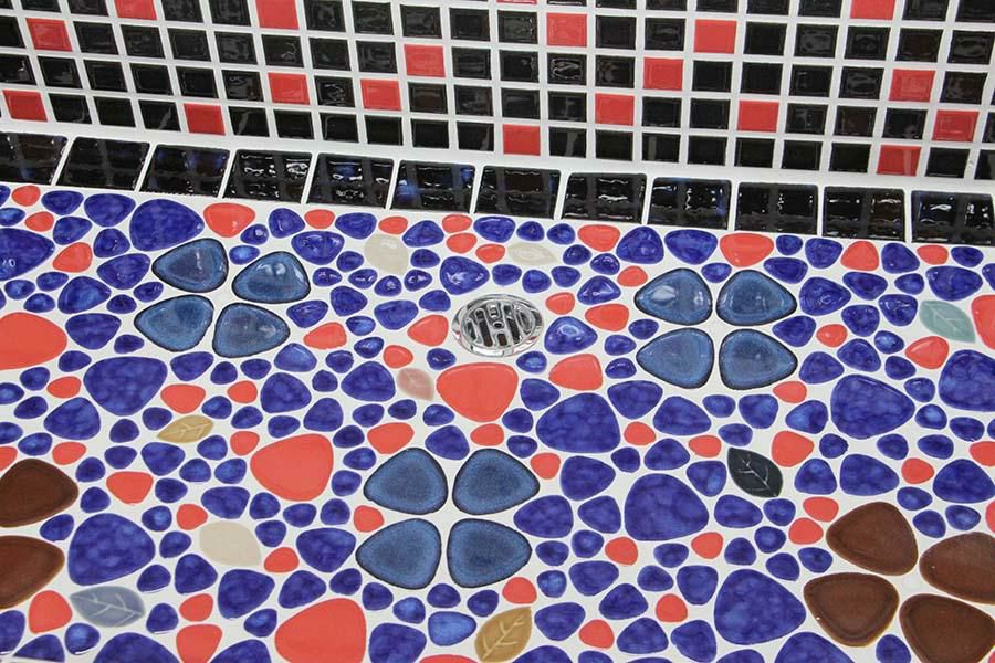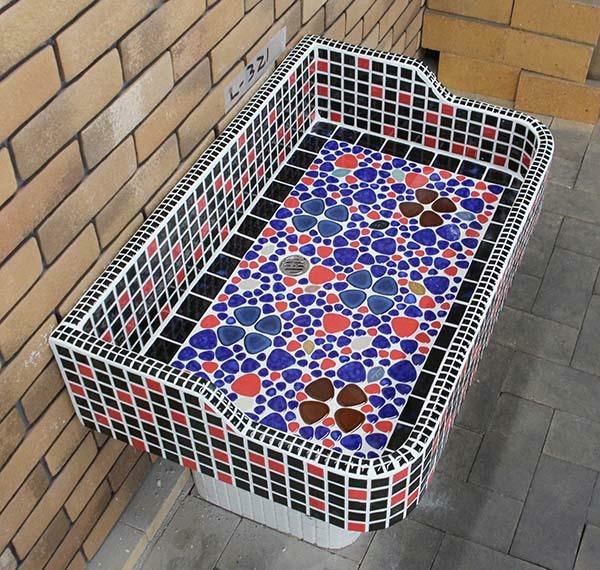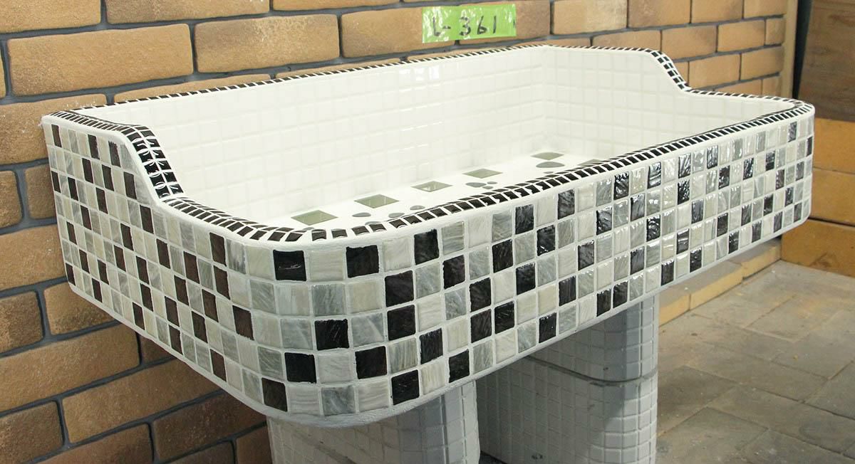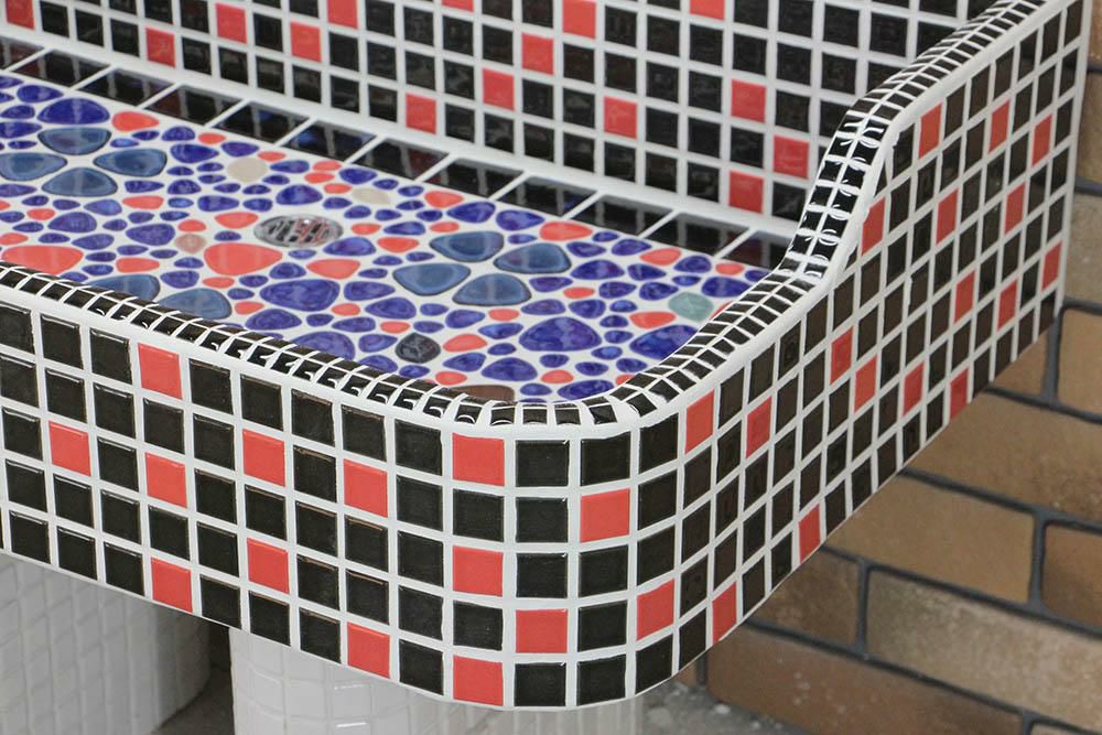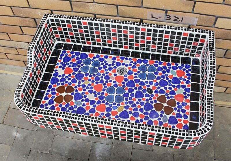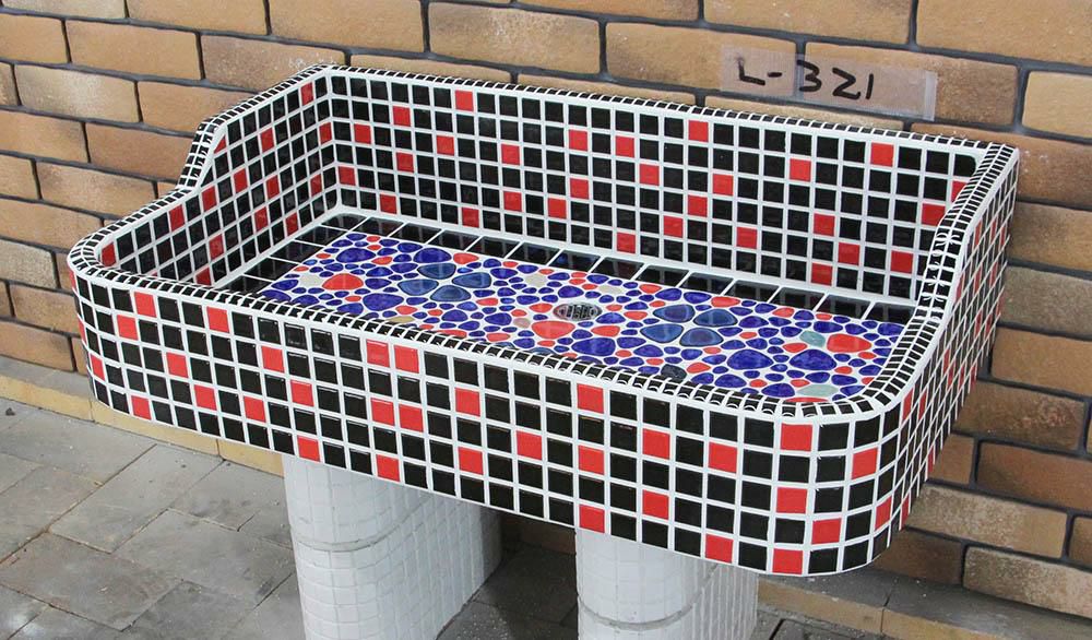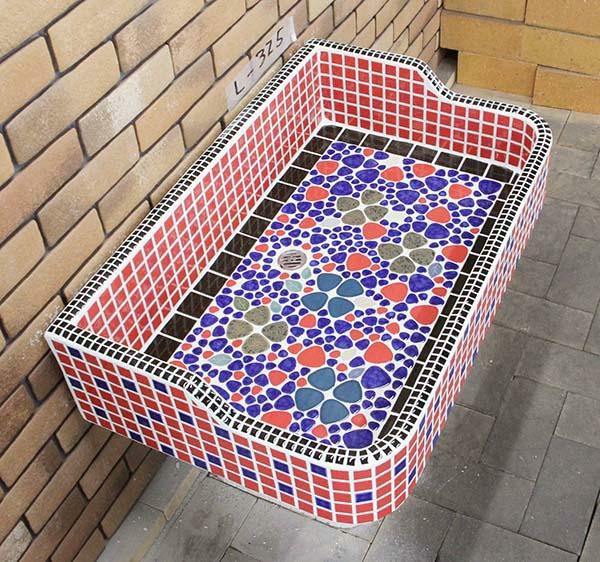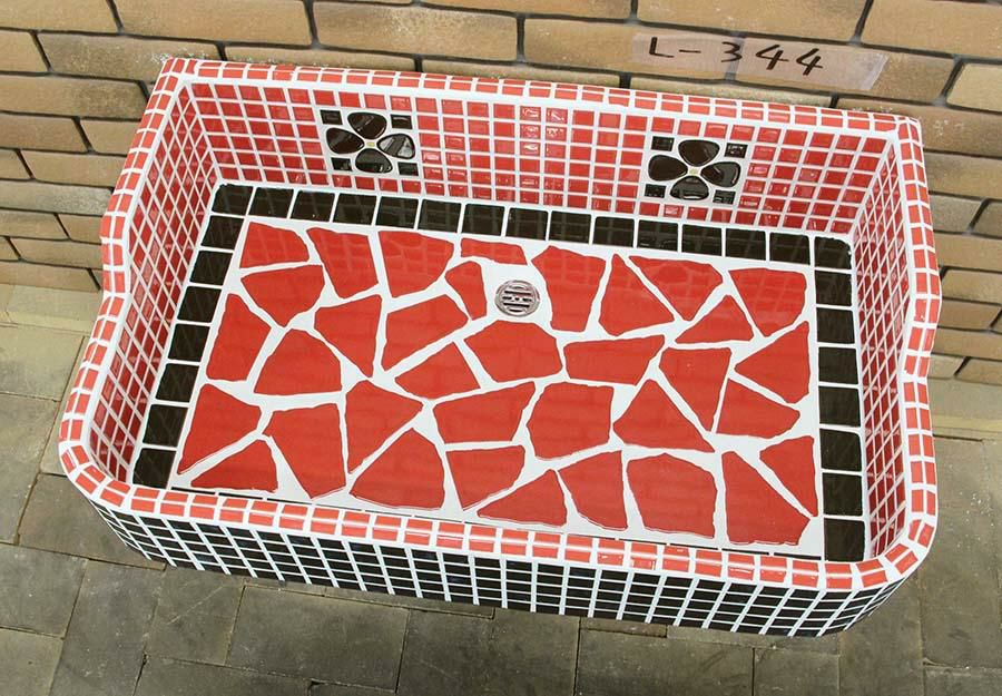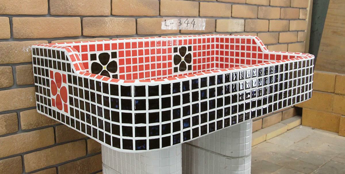 玉川窯業では、モルタル下地のシンクにモザイクタイルを張ってガーデンパンを制作しており、