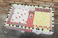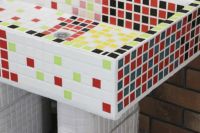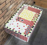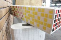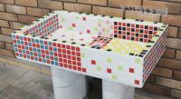 モルタル下地にモザイクタイルを張ったタイル流し台。