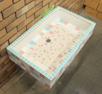 モルタル下地にモザイクタイルを張ったタイル流し台。