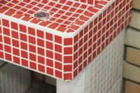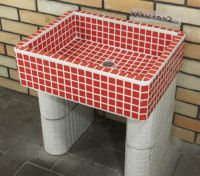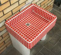 モルタル下地にモザイクタイルを張ったタイル流し台。