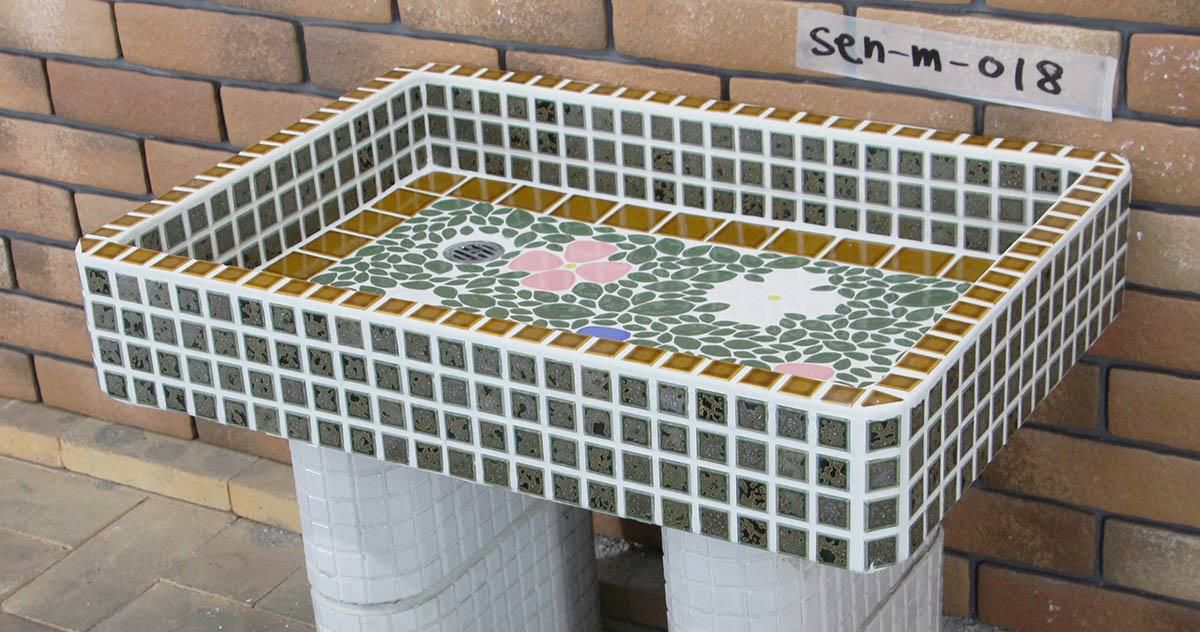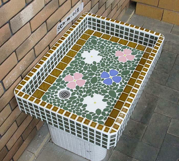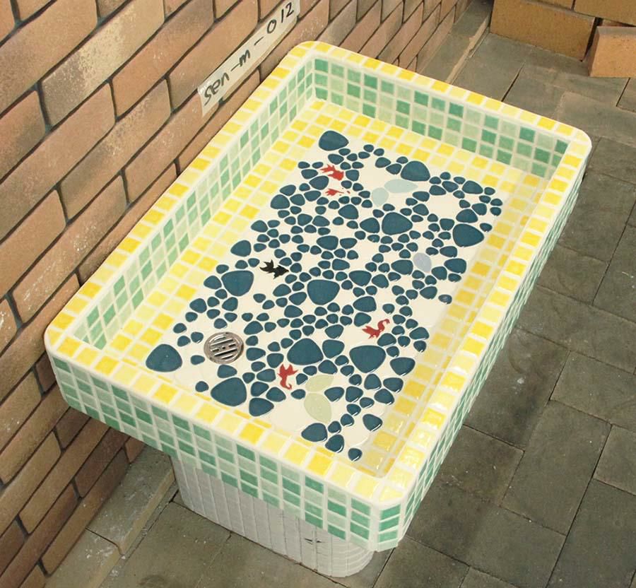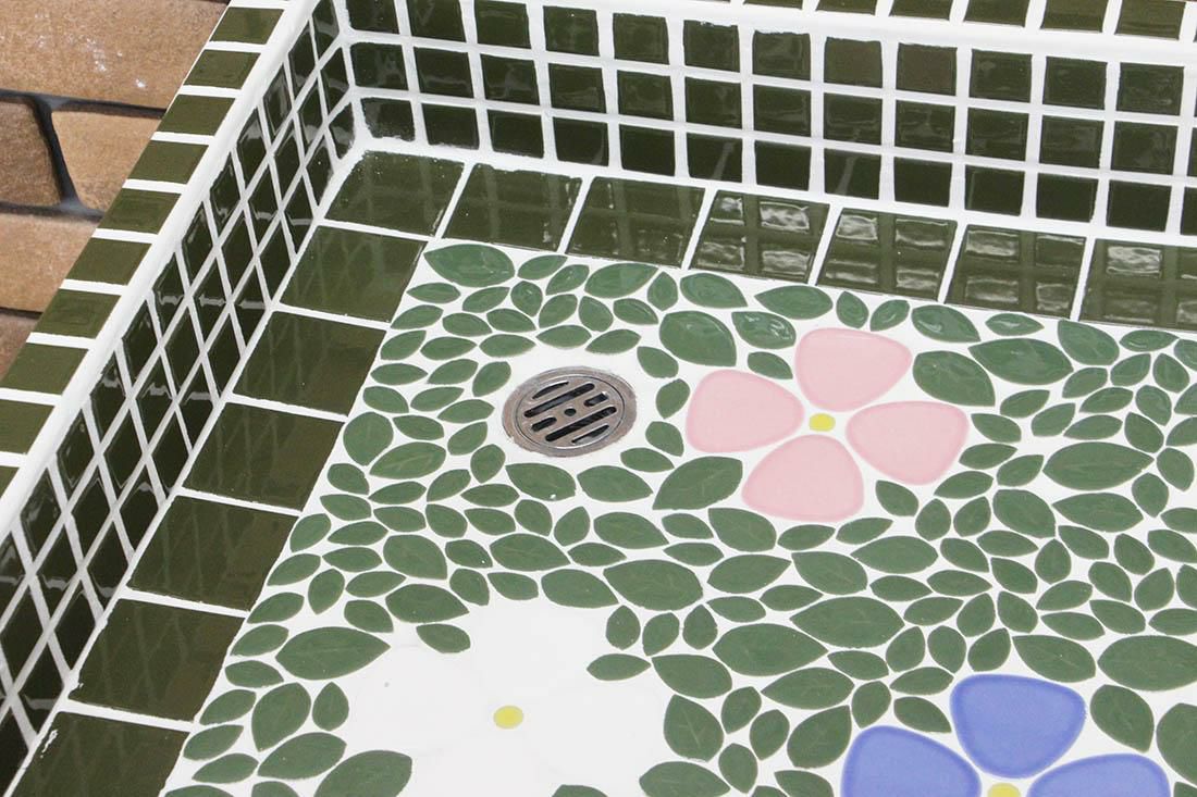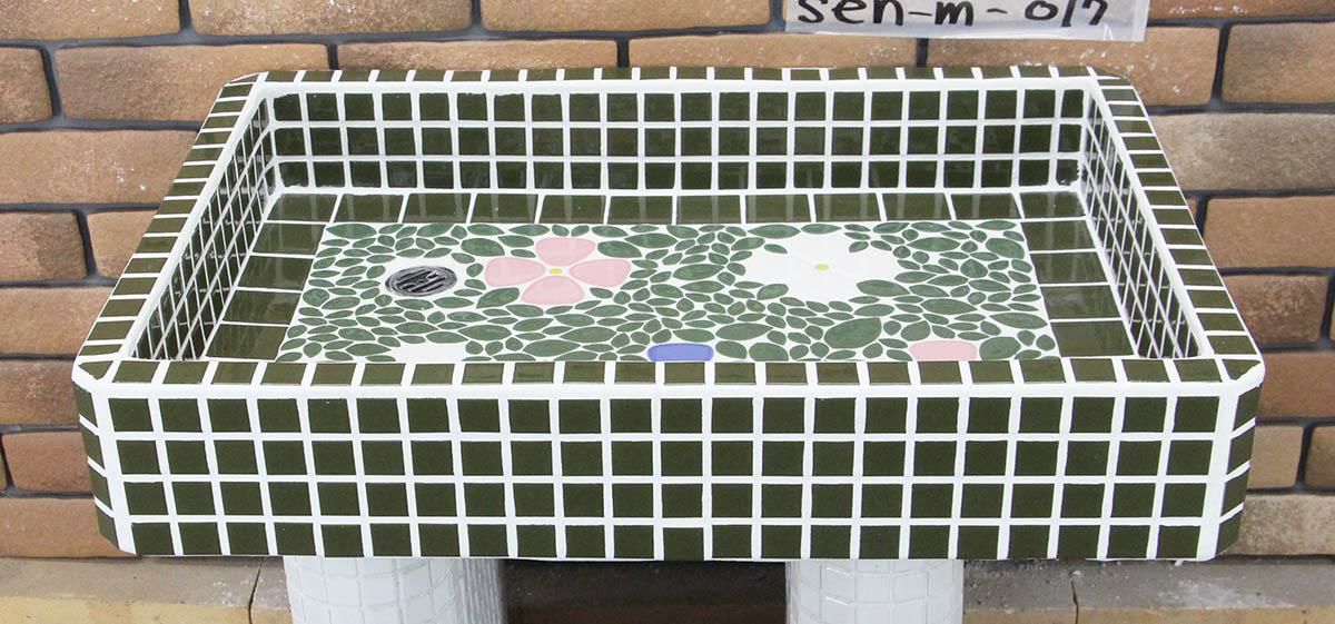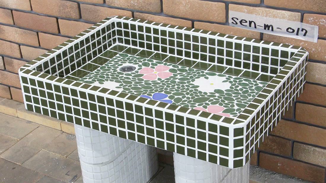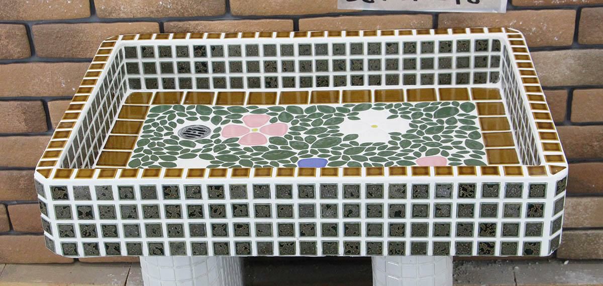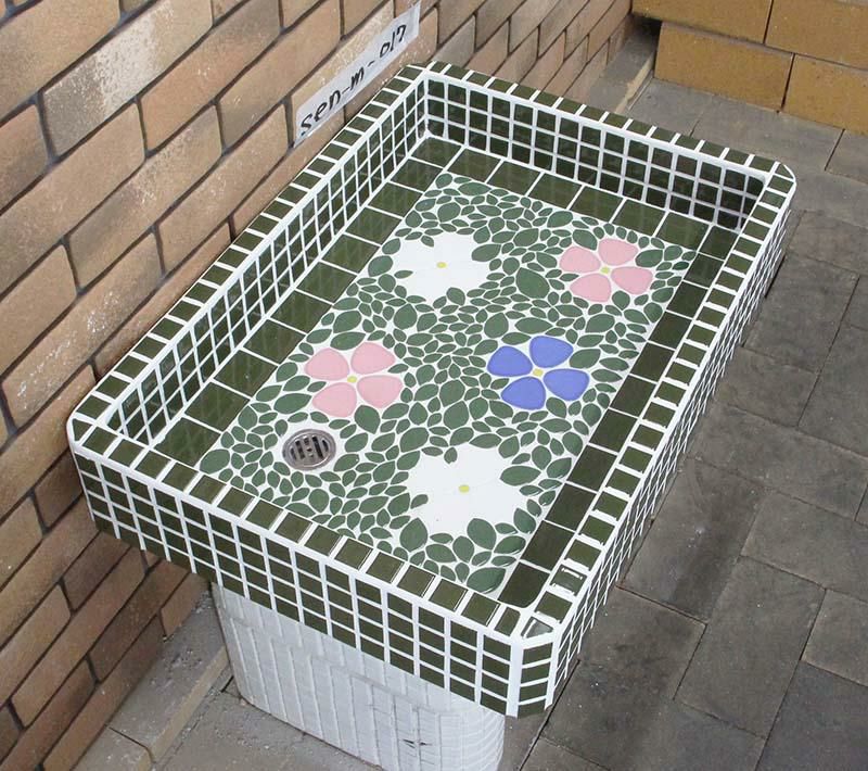 玉川窯業では、モルタル下地のシンクにモザイクタイルを張ってガーデンパンを制作しており、