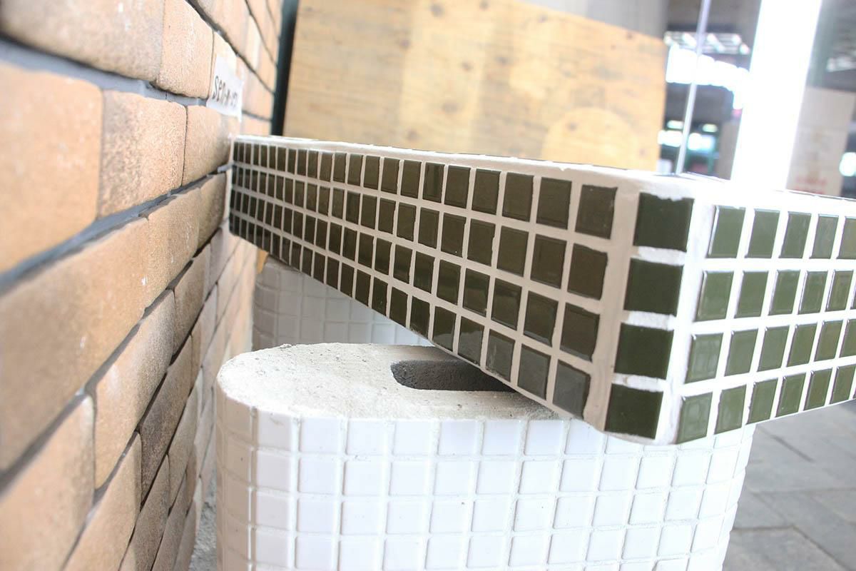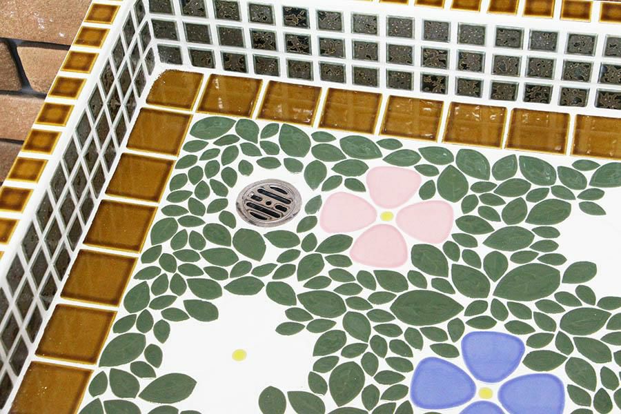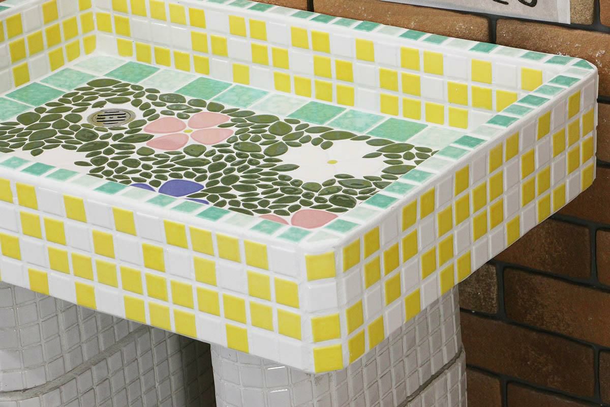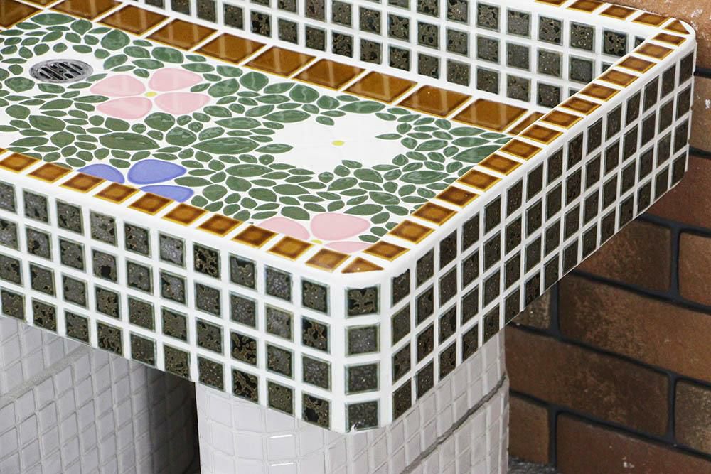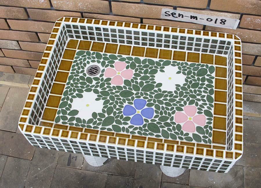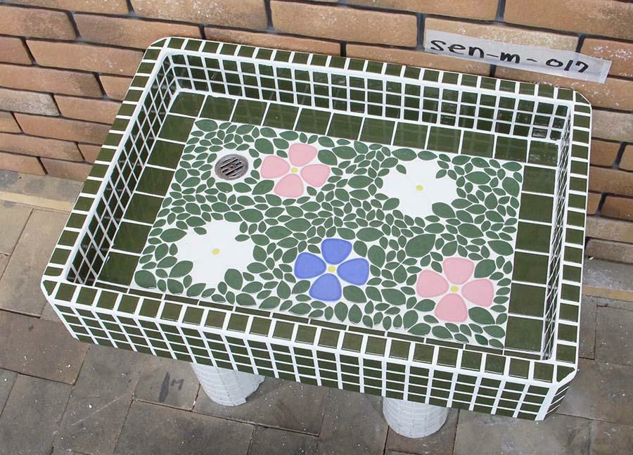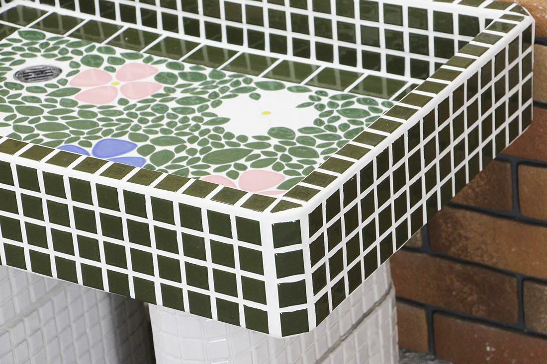 玉川窯業では、モルタル下地のシンクにモザイクタイルを張ってガーデンパンを制作しており、