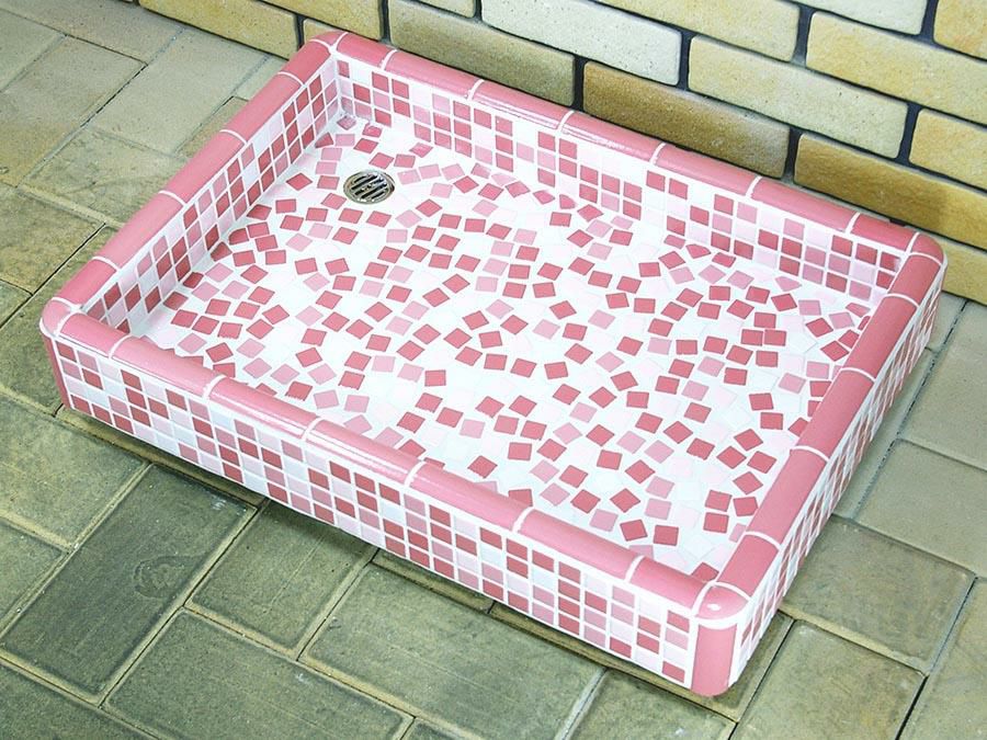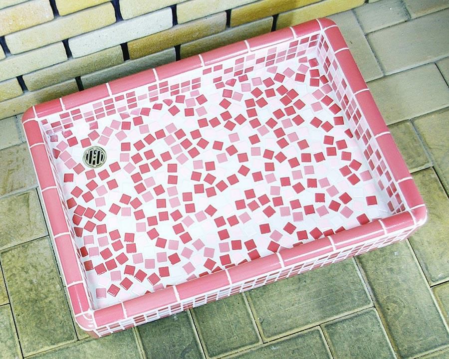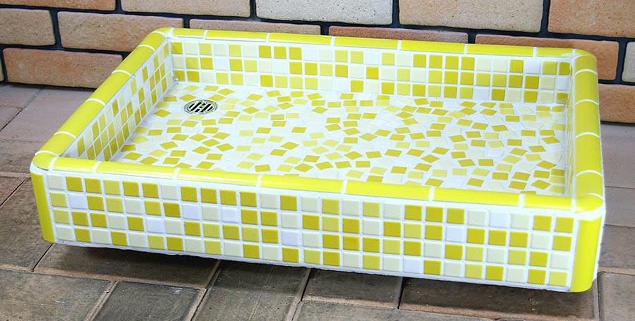 玉川窯業では、モルタル下地のシンクにモザイクタイルを張ってガーデンパンを制作しており、